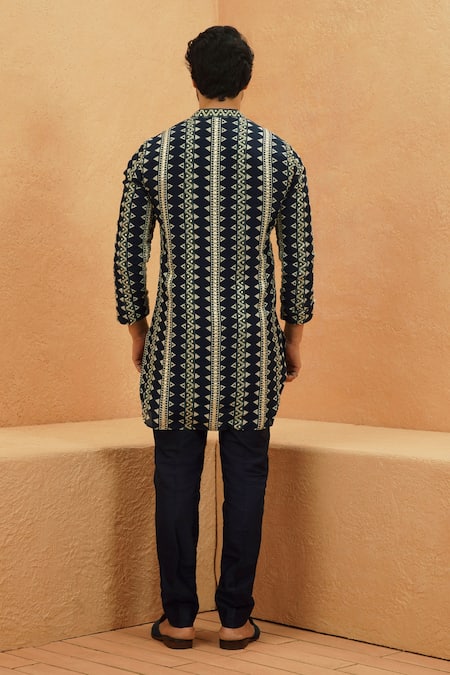 Midnight blue kurta featuring printed embellishments and a straight cut. Paired with matching pants for a complete look.