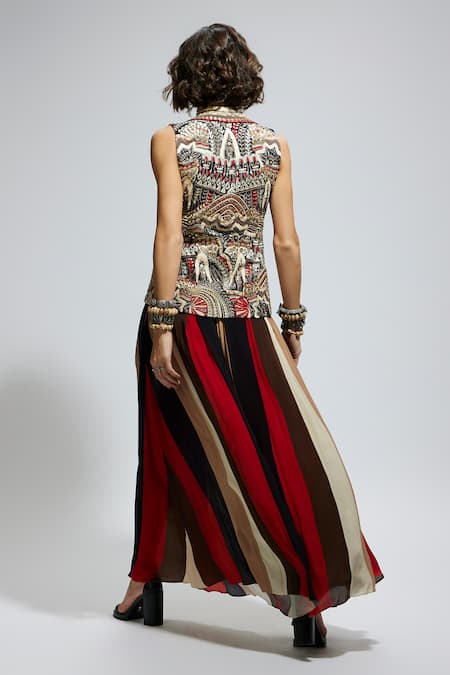 Multicolored jacket featuring a lapel collar with intricate sequin and thread embellishments. Paired with a multistriped flared pant for a stylish look.