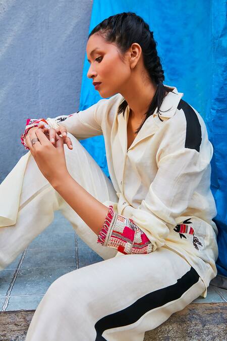 Ivory linen shirt featuring a spread collar, three-quarter sleeves, and embroidered sleeve hems. Paired with matching linen pants, showcasing a black colorblock panel on the shoulder and fisherwoman applique embroidery.