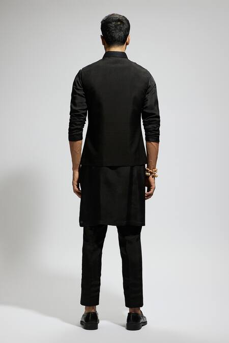 Black sleeveless bundi featuring all-over mask motif embroidery