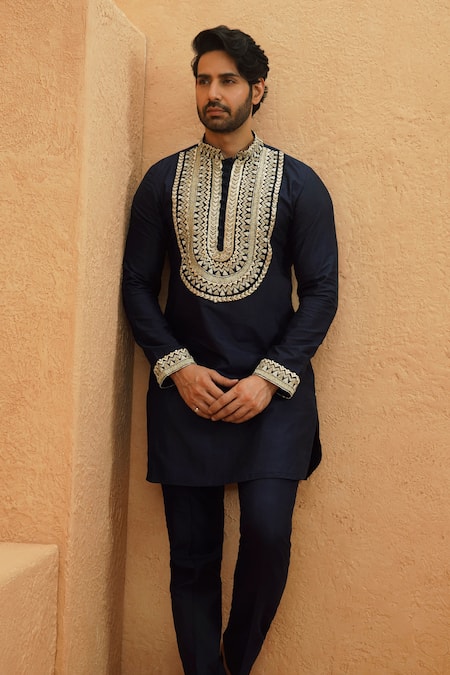 Midnight blue kurta featuring intricate embroidery along the neckline and cuffs. Paired with matching slim-fit pants made from crepe fabric.