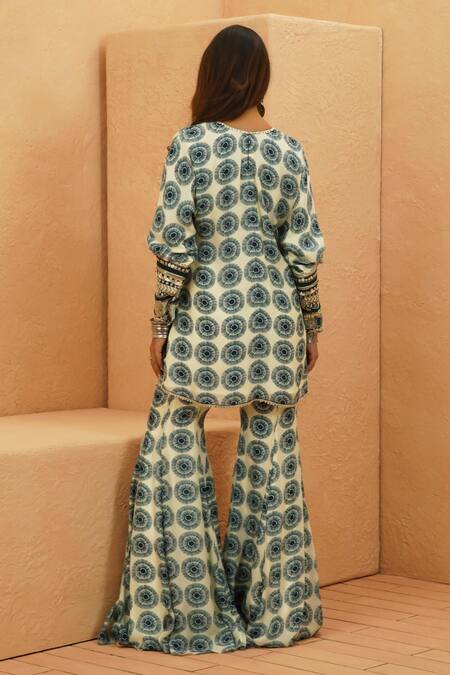 Intricate embellishments on sleeves, Flared silhouette of sharara, Unique printed pattern throughout