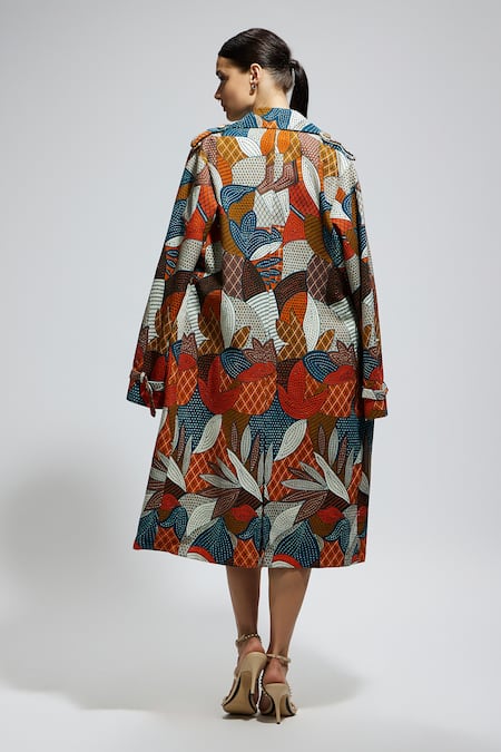Multicolor trench coat featuring an abstract print and full sleeves