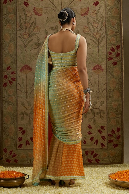 Orange ombre saree featuring a floral print and embellished with beads and pearls. Paired with an embellished bustier for a complete look.