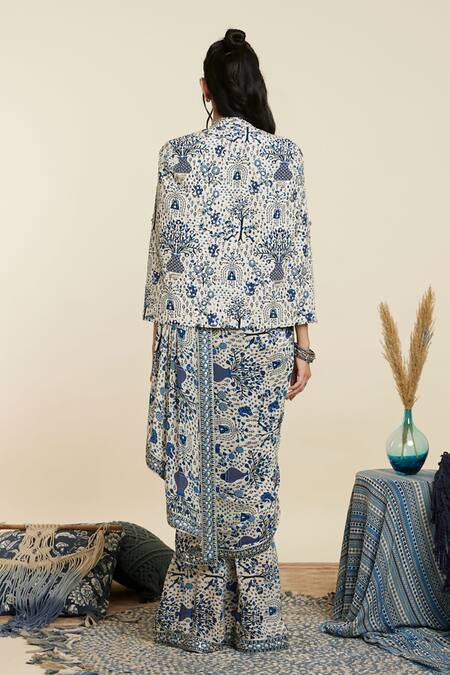 Blue pre-draped saree featuring asymmetric drape detailing and floral, peacock, and jungle prints with an embroidered border. Accompanied by a jacket with all-over jungle and floral print, and a geometric embroidered blouse.