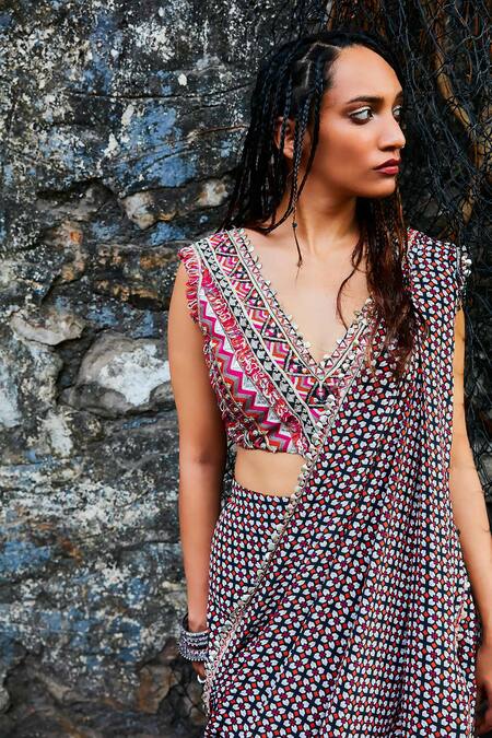 Black pre-draped saree featuring geometric print and embellished border. Paired with a crop top adorned with sequin, bead, cutdana, and thread embellishments.