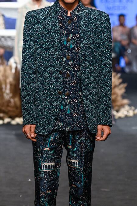 Blue blazer with feather print. Paired with mor print bundi & pant.