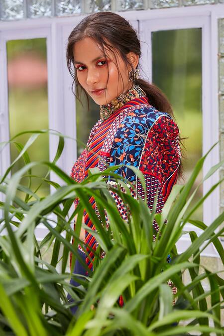 Blue cape with floral print & patchwork embroidery. Paired with bustier & drape skirt.