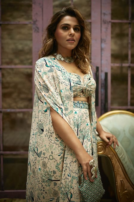 Beige crepe silk cape with mor jaal print. Paired with printed pants with box pleats & sweetheart neck bustier bikini with front twist detail..
