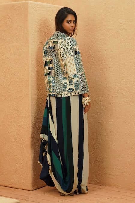 Multi-colored cape jacket featuring intricate patchwork design. Paired with a printed drape skirt and bustier in crepe fabric.
