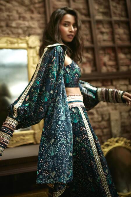 Blue structured cape jacket with mor jaal print, spread collar, bishop sleeves & metallic embellishment Paired with printed pants with box pleats & V neck bustier.