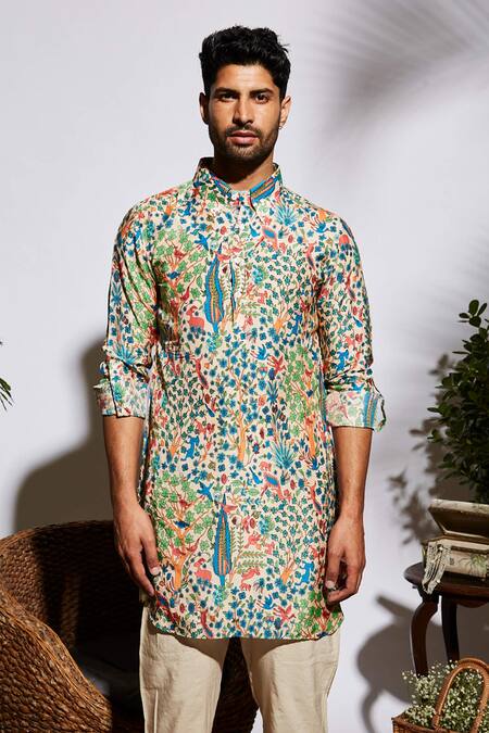 Beige short kurta with rolled up sleeves. Comes with floral and animal prints.