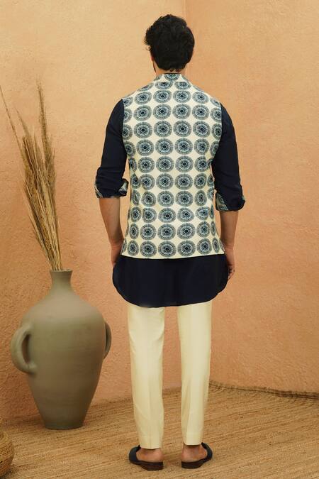 Midnight blue reversible bundi featuring a unique print.