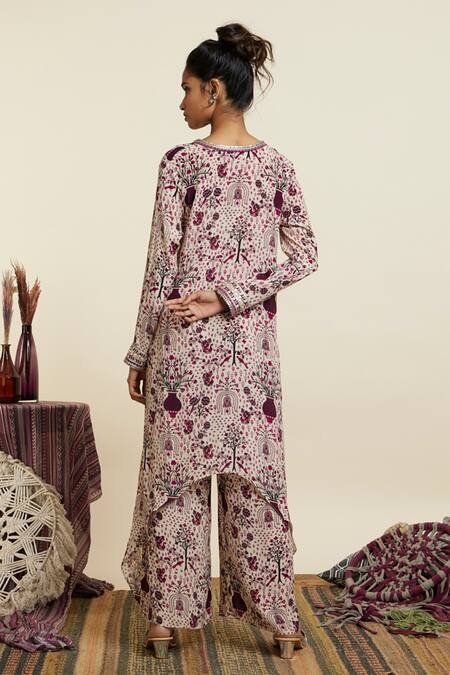 Peach Crepe Botanic V Neck Safar Front Tie Up Tunic And Palazzo Set