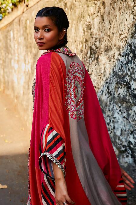 Sequin embellished border on cape, Chevron embroidered lehenga, Multicolor thread work in stripes