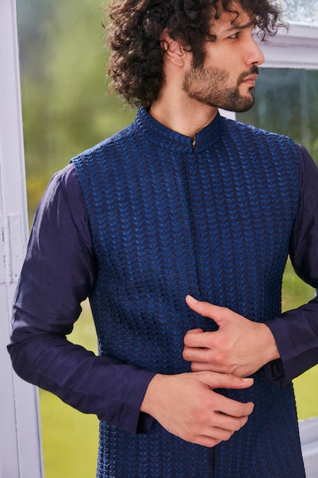 Blue long bundi with leaf embroidery & mandarin collared neckline.