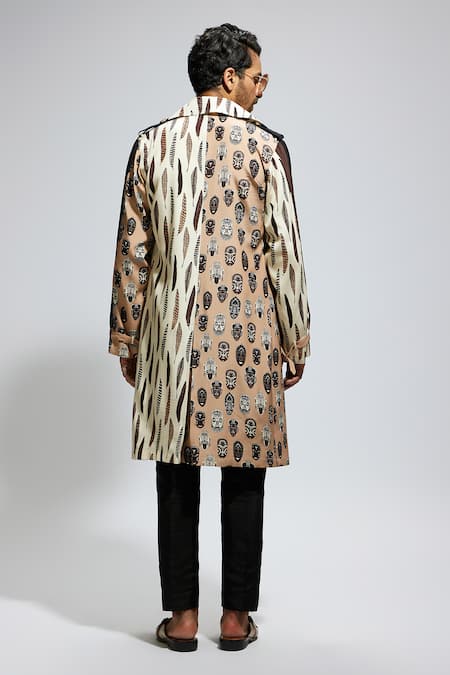 Black and ivory silk trench coat featuring multicolour tribal mask and feather patterns