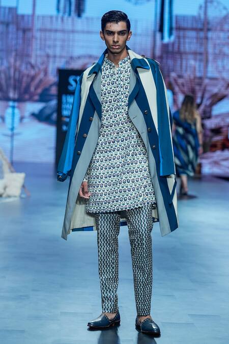 Blue kurta featuring bloom garden print with scallop print pants. Accompanied by a blue full sleeves lapel collar trench coat with an all-over striped pattern.