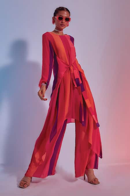 Red striped kurta with tie up detail in front and asymmetrical hem. Comes with co-ordinating flared pants.