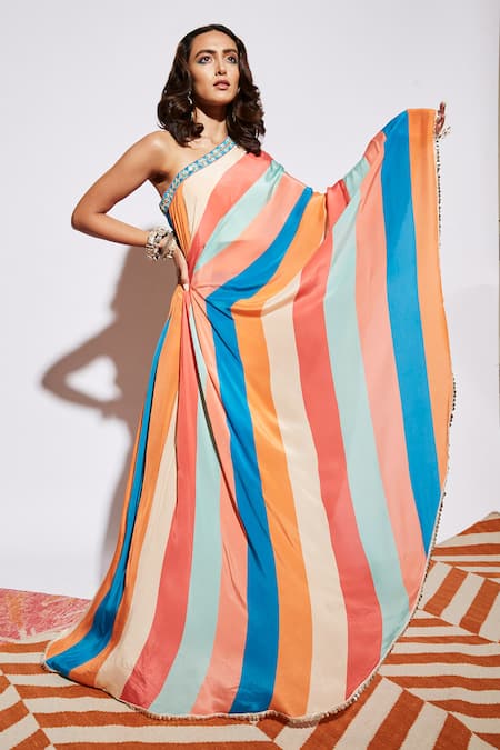 Multi Color Silk Embroidery One Shoulder Striped Pre-draped Saree With Pant