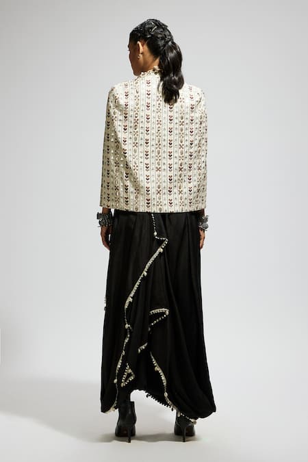 Ivory jacket featuring thread and sequin applique embroidery in geometric pattern. Paired with a textured black bustier and draped skirt.