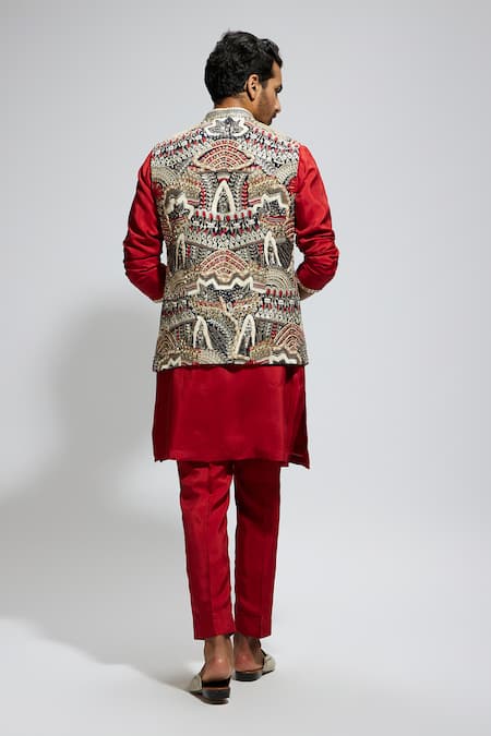 All-over tribal embroidery, Band collar with intricate detailing, Contrasting color combination