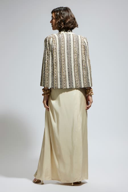 Ivory Silk Sequins Open Neck Tribal Embellished Jacket