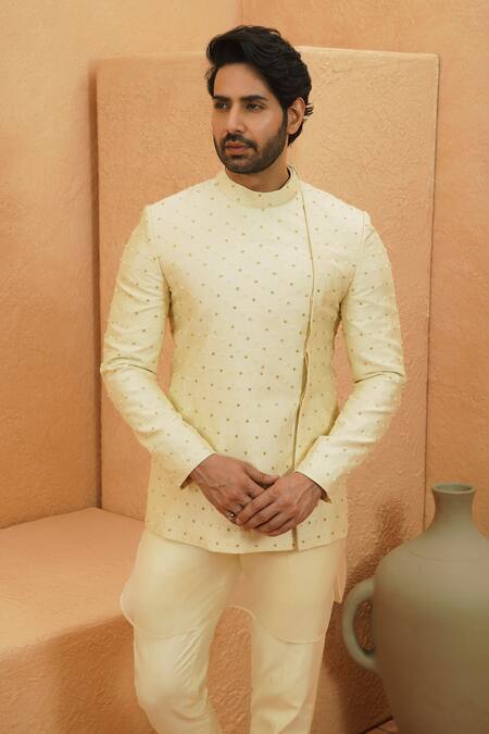 Ivory Bandhgala crafted from silk featuring embellishments throughout.