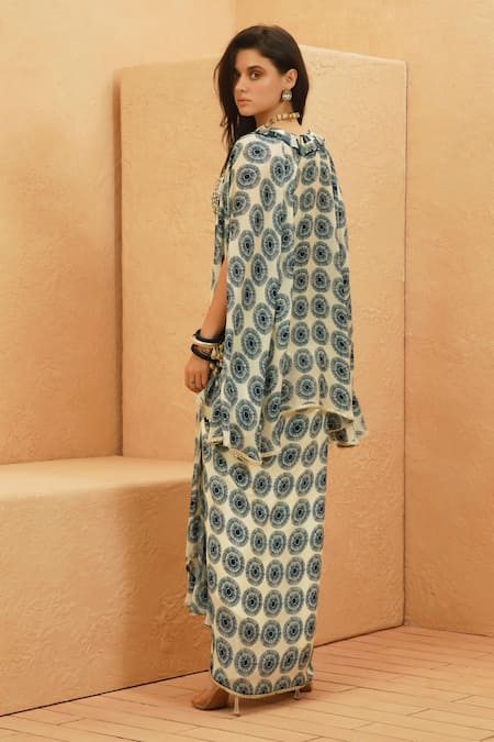 Metallic detailing on the bustier, Drape style of the skirt, Flowy cape design