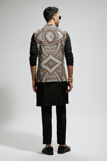 Bundi featuring zentangle geometric print, embellished with sequins and cutdana. Paired with a black kurta and pant.