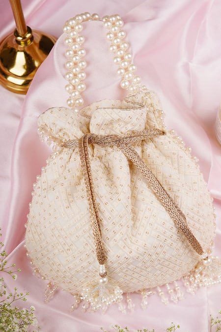 White potli bag featuring broken stripe embroidery and bead tassel embellishments. Comes with a pearl embellished handle and drawstring closure.