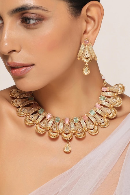 Gold toned necklace featuring mint and pink stone embellishments. Paired with matching earrings that complement the necklace design.