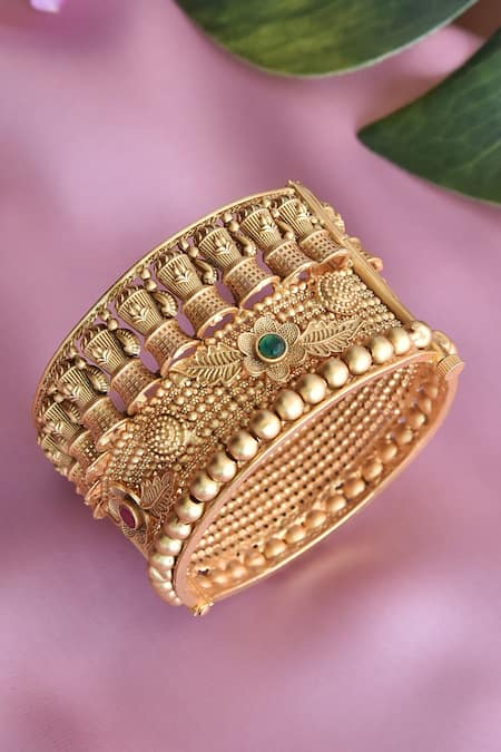Gold toned kada featuring intricate red and green floral embellishments