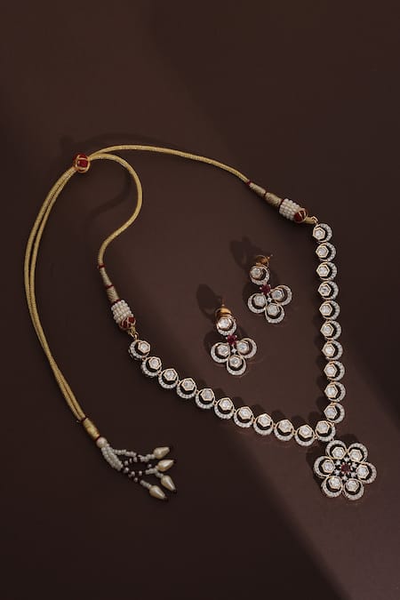 Adjustable dori closure on necklace, Push back closure for earrings, Intricate floral design with polki stones