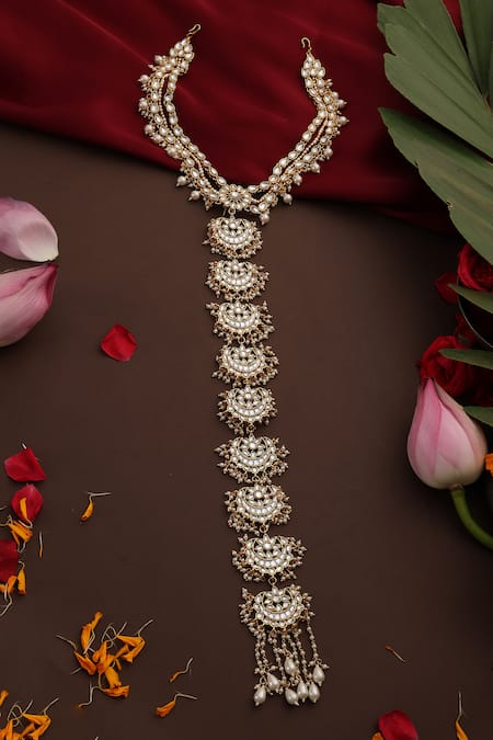 Cascading chain design, Kundan crescent motifs, Pearl drop embellishments
