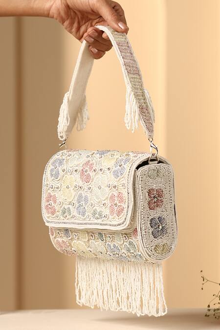 Intricate floral beadwork, Pearl tassel embellishments, Structured flap with magnetic closure