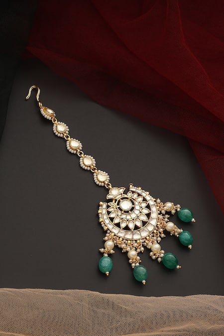 Gold plated floral cutwork maangtikka featuring polki highlights and green beads