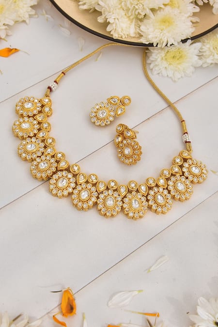 Gold floral motif necklace featuring intricate kundan embellishments. Paired with matching earrings adorned with a similar floral design.
