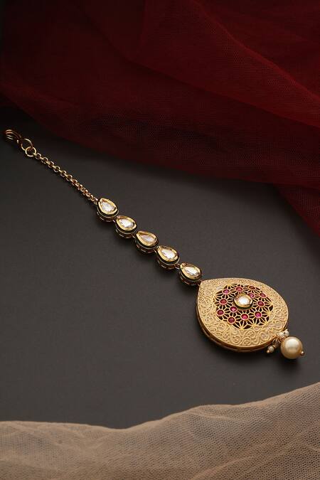 Gold tone maangtikka featuring intricate kundan embellishments in a floral pattern