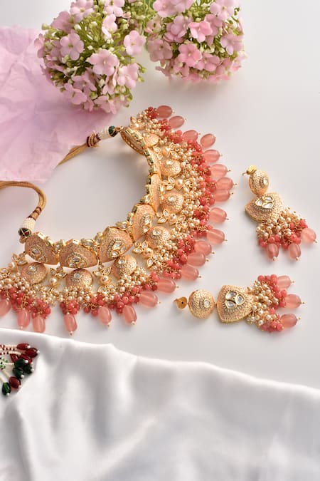 Buy_Swabhimann_Pink Beads, Diamonds Moissanite Polki Embellished Choker Set _Online_at_Aza_Fashions