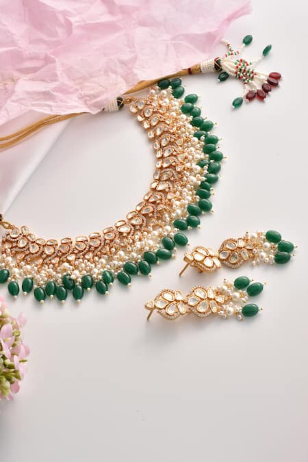 Buy_Swabhimann_Green Beads, Diamonds Polki Embellished Choker Set _Online_at_Aza_Fashions