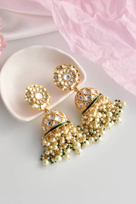 Gold toned floral shaped jhumkas featuring polki embellishment and pearl tassel drops