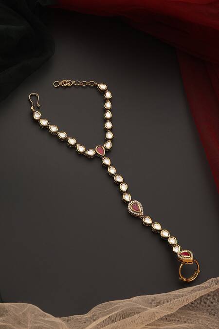 Gold plated haathphool featuring tear drop cutwork design with red kundan highlights