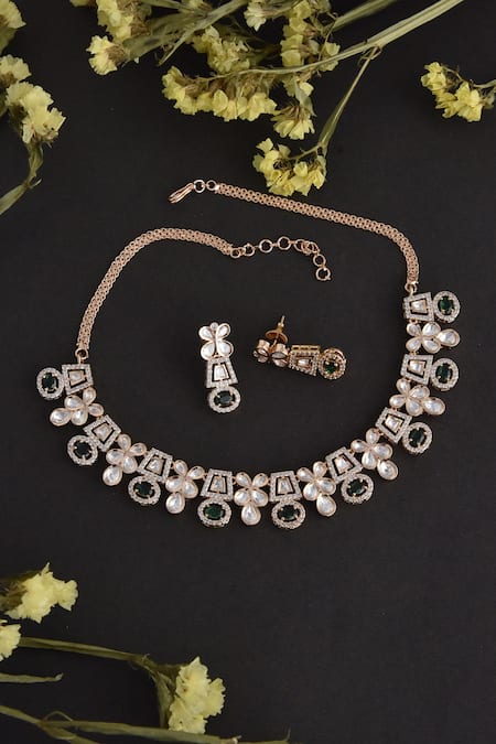 Buy_Swabhimann_Green Crystals, Diamonds, Stones Uncut Polki Embellished Floral Necklace Set _Online_at_Aza_Fashions