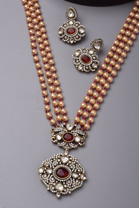 Red Diamonds, Stones Victorian Polki Embellished Long Pendant Necklace Set