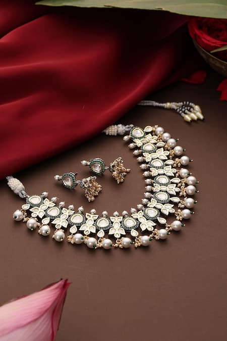 Kundan stone embellishments in floral motifs, Pearl drop detailing on necklace and earrings, Jhumka style earrings with pearl accents