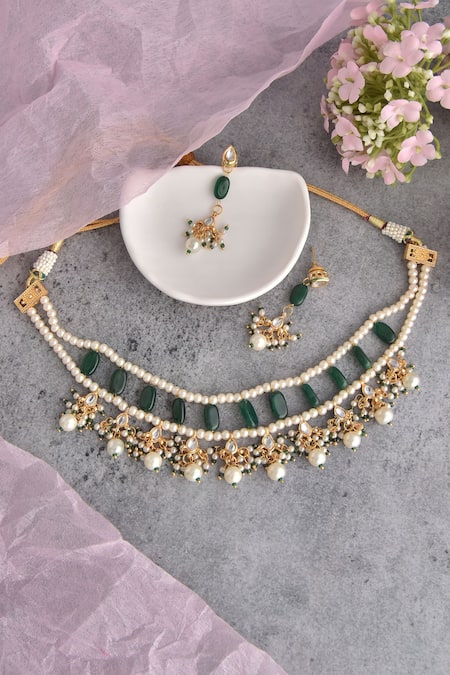 Green necklace featuring pearl embellishments and kundan drops. Paired with matching earrings adorned with green beads.
