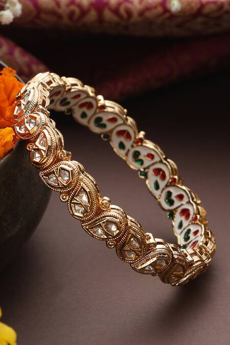 Gold plated bangle featuring paisley cutwork design with kundan accents
