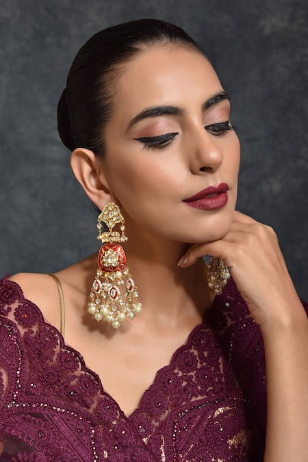 Intricate kundan embellishments, Elegant red enamel work, Delicate pearl drops