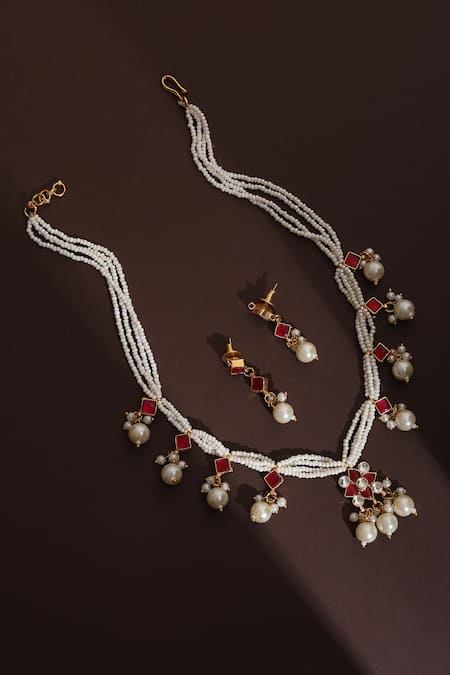 Multi-string design with floral geometric patterns, Red kundan embellishments, Pearl drops cascading from the necklace